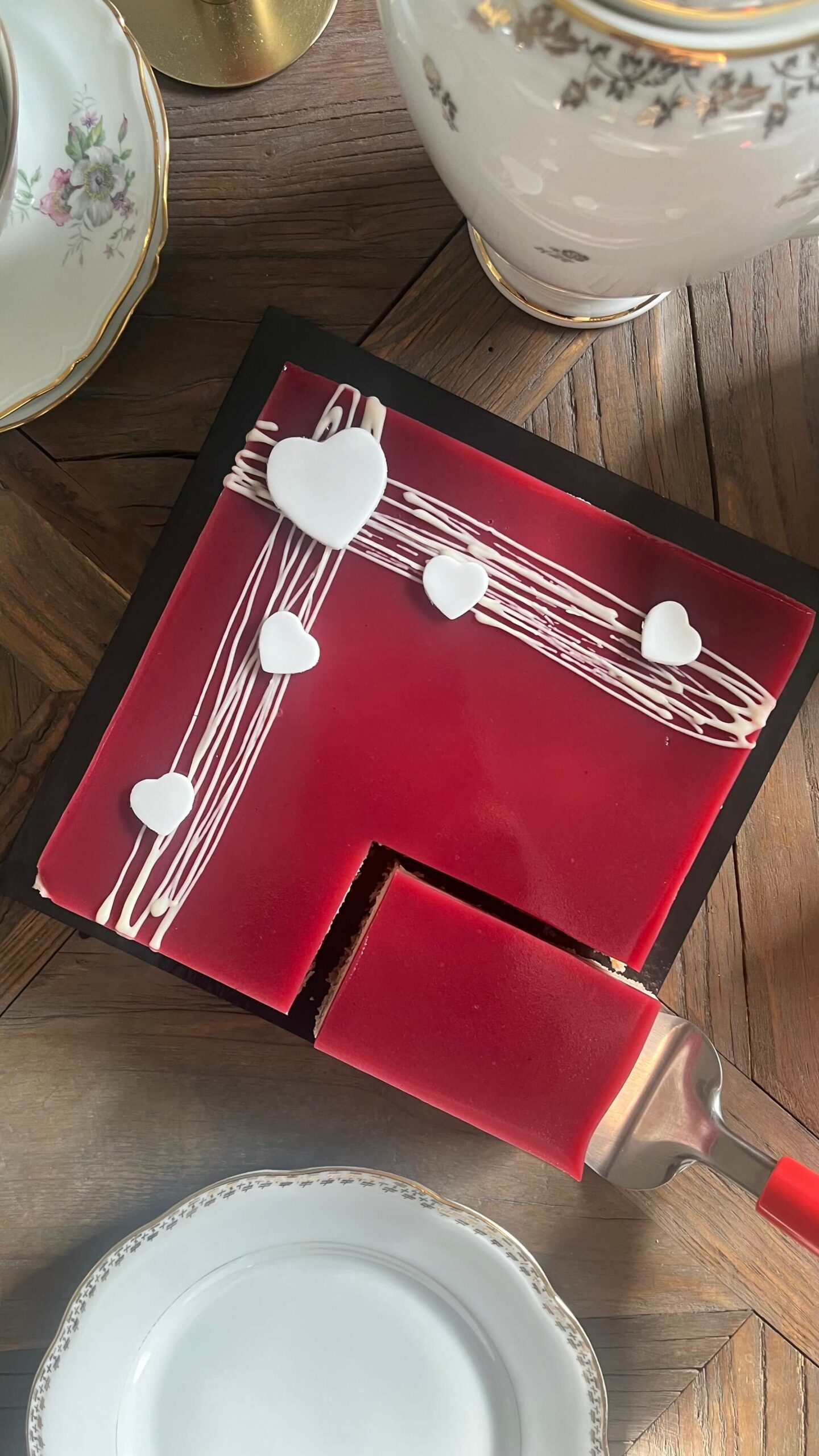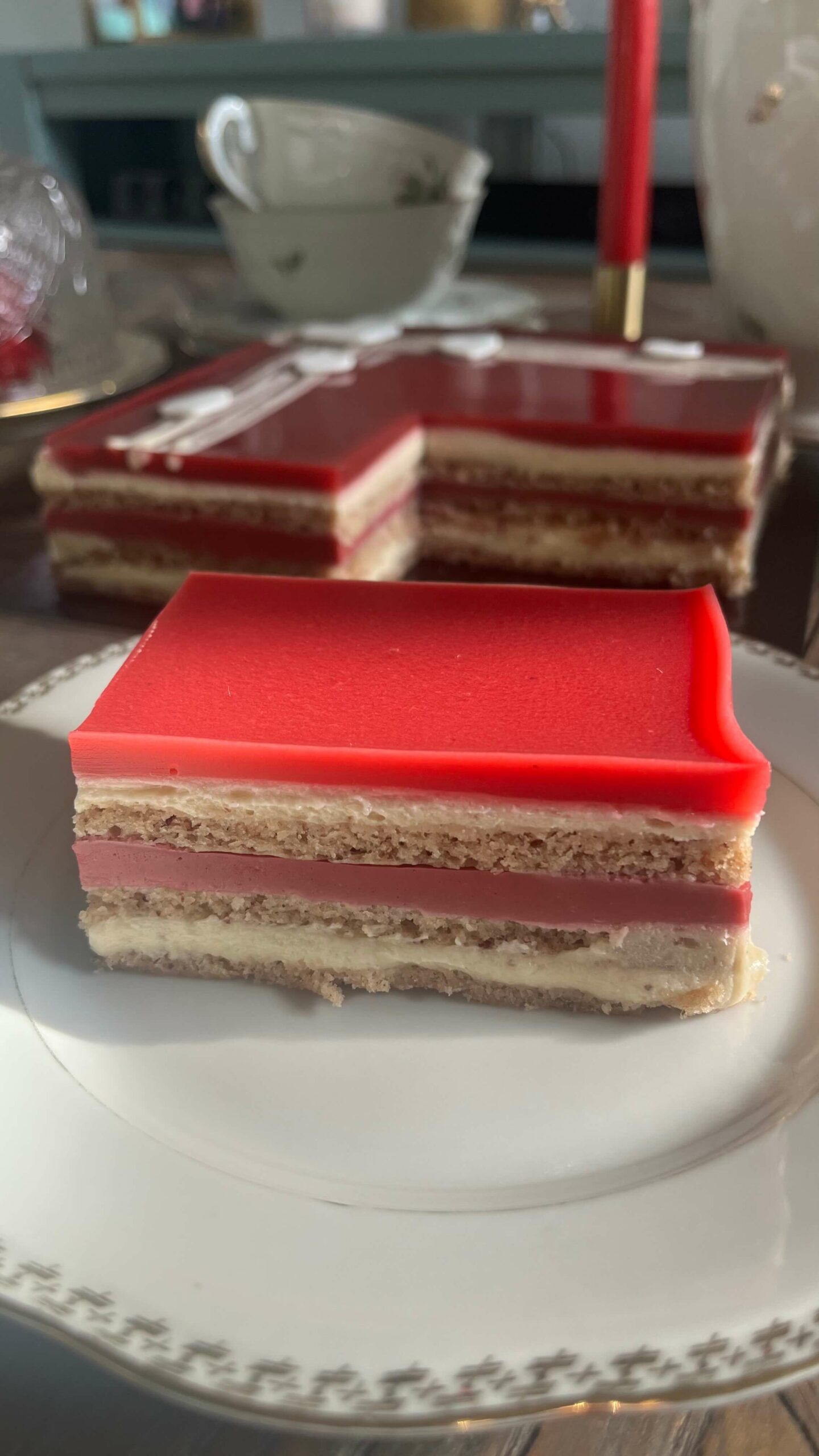 L’Opéra revisité en version fruits rouges. Il se compose d’une génoise, d’une crème mousseline vanille, d’un crémeux fruits rouges et il est recouvert d’une gelée de fruits rouges.